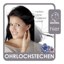 Wir nutzen zum Ohrlochstechen das neue System vom Weltmarktführer Studex mit sterilen Einwegkartuschen. Das Setzen der Ohrlöcher ist hiermit geräuscharm, kaum spürbar, sanft und sicher.